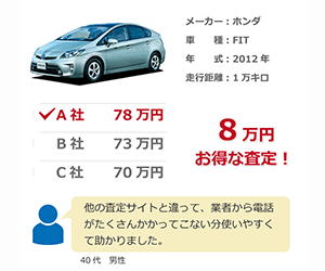 また、本サービスは他の車査定サービスと違い、概算査定を提示するまでは、 当サービスと提携しているコールセンターのみが顧客へ結果を連絡するので、 他の車査定サイトのように、多数の車買取業者から車査定に関する電話が掛かってくることは一切無し!